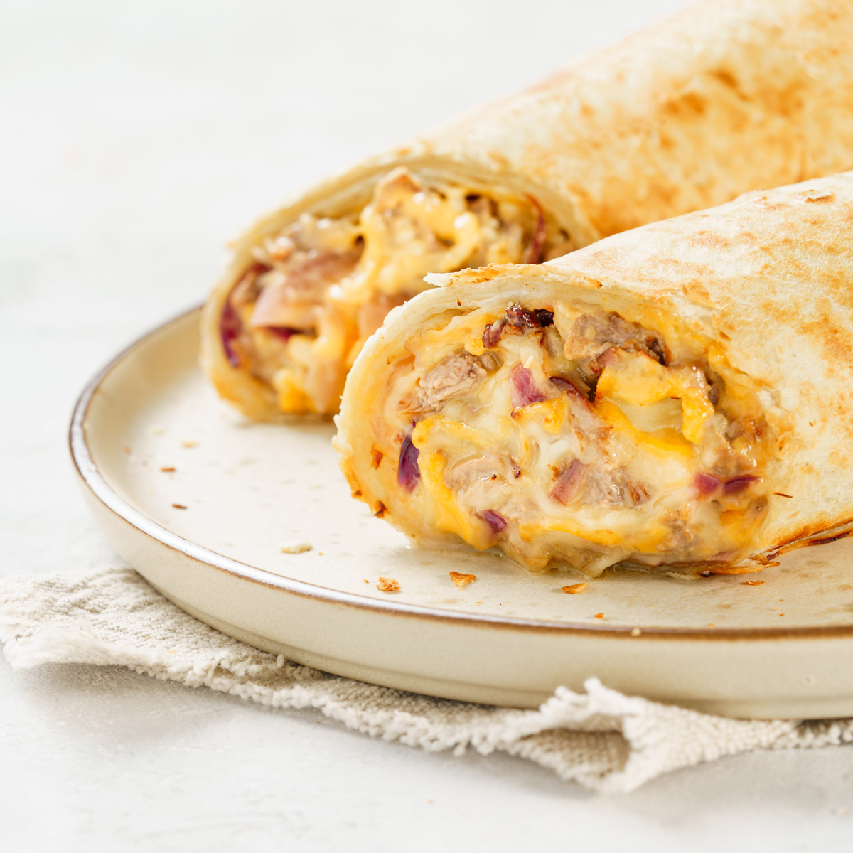 Tortilla de trigo, carne de ternera, cebolla, queso tybo, queso cheddar.